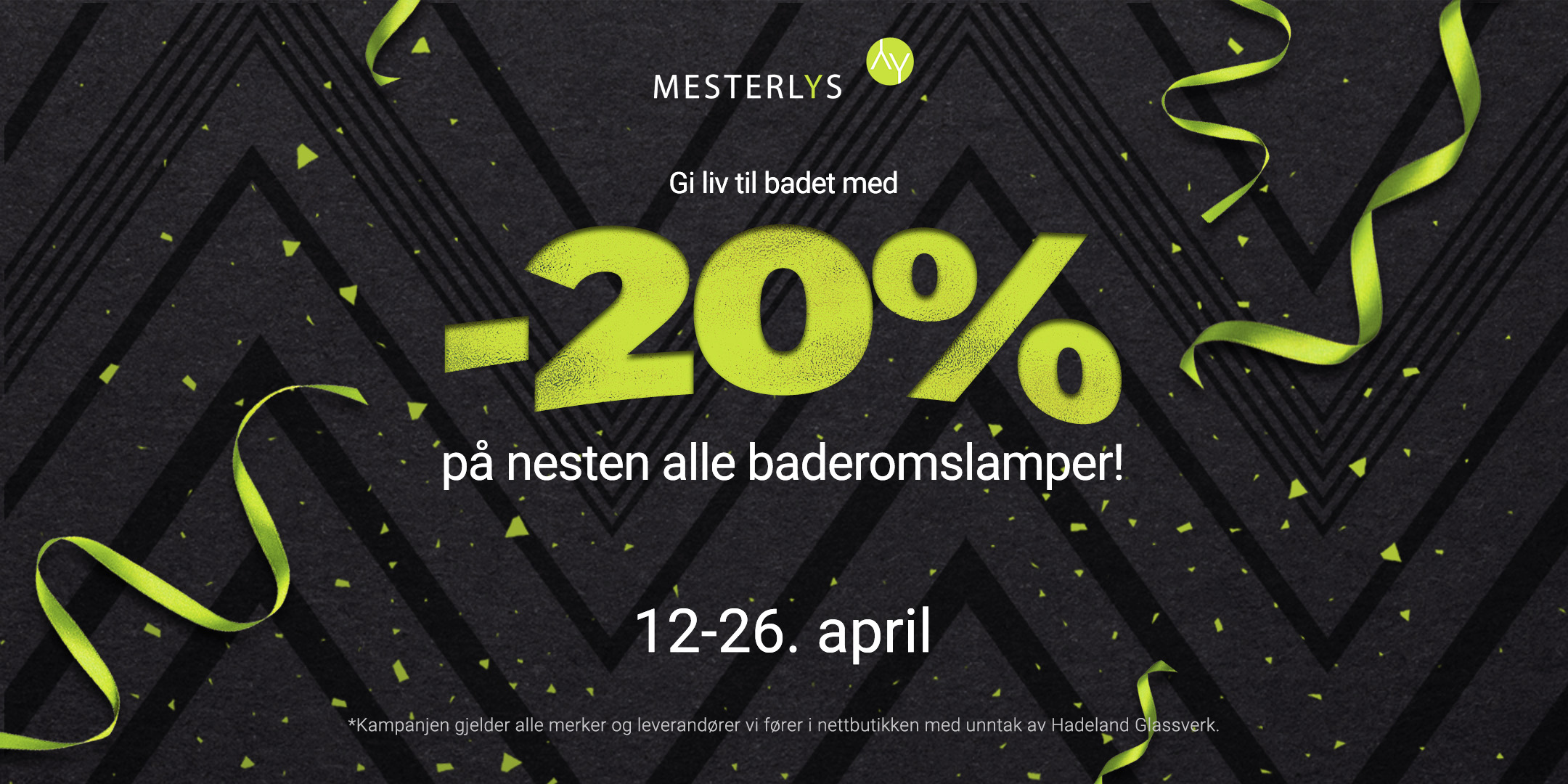 Fra og med søndag 12. april til og med søndag 26. april kan du sikre deg mange baderomslamper til nedsatt pris – både i nettbutikken og i våre fysiske butikker!