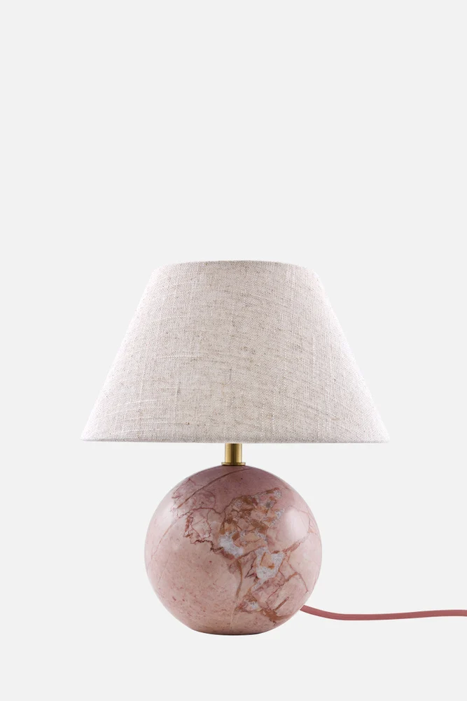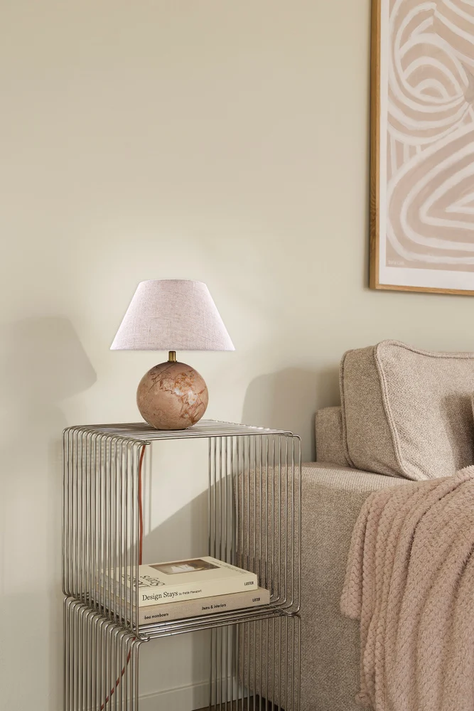 Castello bordlampe har et elegant design der det eksklusive naturmaterialet i solid stein skaper en fin kontrast til lampeskjermen i vakkert linstoff. Lampeholder og rør er i ekte messing, 200 cm lang beige tekstilkabel med bryter og Europlug. Vær oppmerksom på at stein er et naturmateriale, farge og variasjoner i marmorering varierer og skaper et unikt mønster for hver lampe, derfor kan lampen du har avvike litt fra bildene.