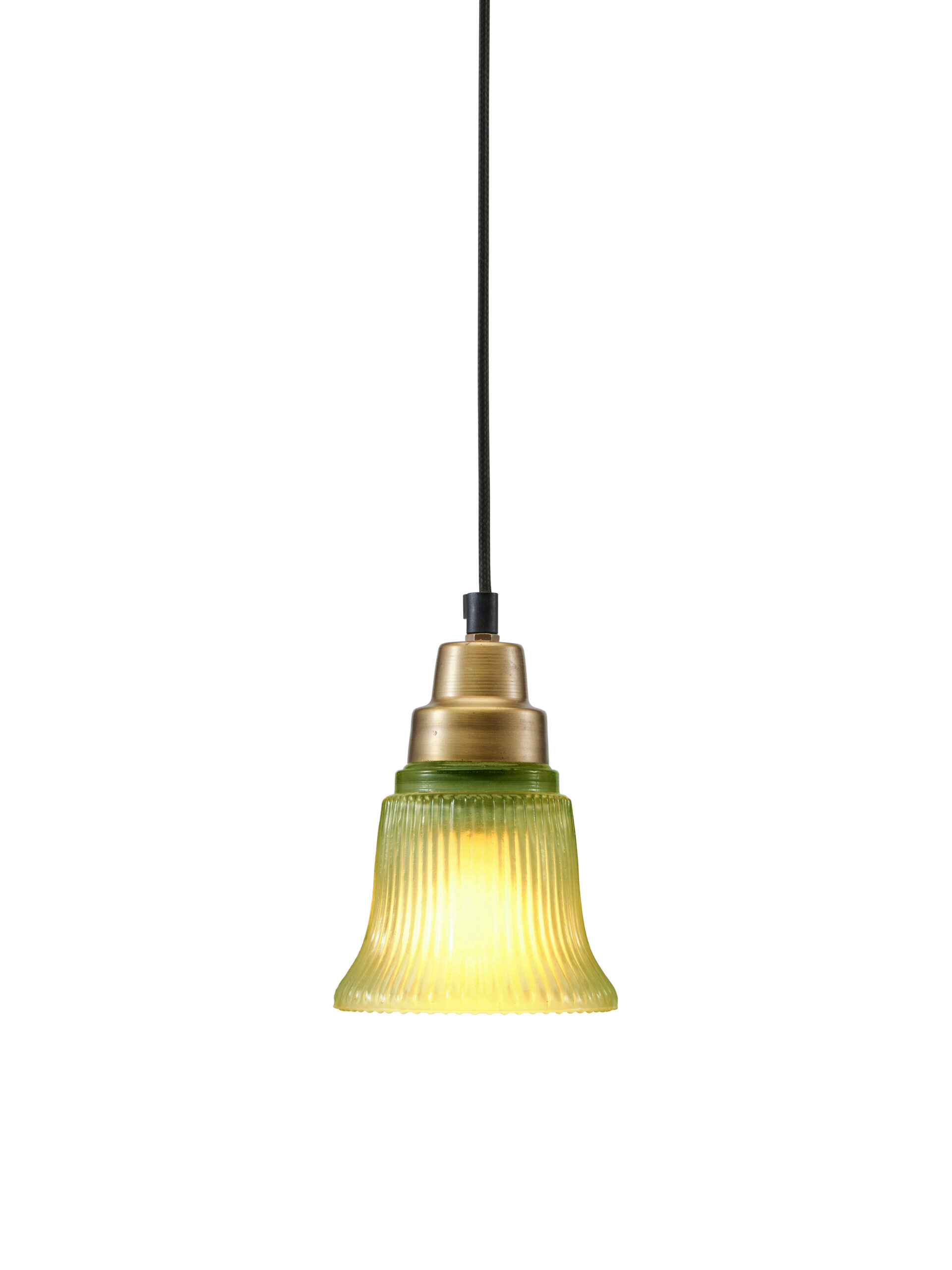 Vinduspendel Emmi, med en klokkeformet ribbet glassskjerm og detalj i antikk messing. En vakker, liten pendellampe i en klassisk vintage-modell. Gir en varm glød av lys med grønnfarget ribbede glass .