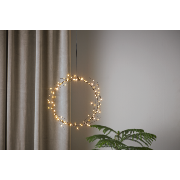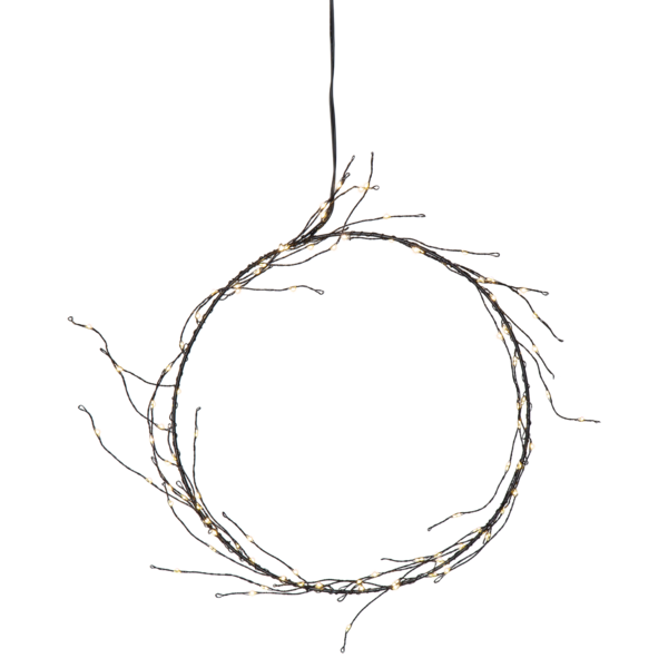 Stemningsfull krans i svart, 95 små led-lys skinner fint. Pynt til jul eller hvorfor ikke så snart den mørke årstiden begynner.