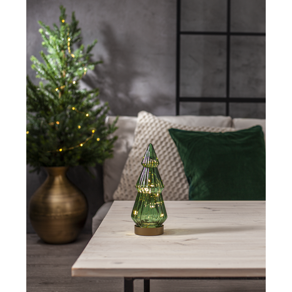 Stilig batteridrevet borddekorasjon formet som et grantre i gjennomsiktig mørkegrønt glass. Gullfarget base som skjuler batteriboksen. Drevet av 3 AAA-batterier. Gir en vakker glød som dekorasjon på for eksempel julebordet.